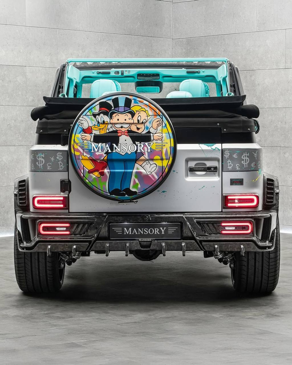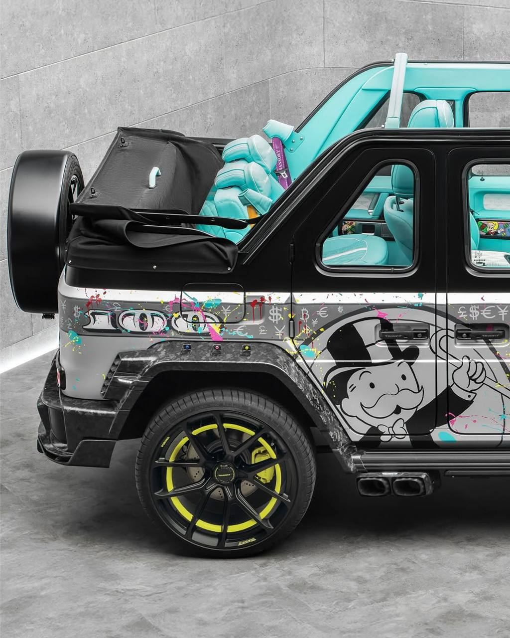 The collab features a custom Mercedes G-Wagon painted in bright colors, Monopoly graphics, and Alec’s signature spray paint aesthetic, something that’s long drawn criticism in the art world. Alec Monopoly made a name for himself by repurposing the classic Monopoly Man and cartoon-style money imagery, sparking years of debate over originality and artistic integrity.