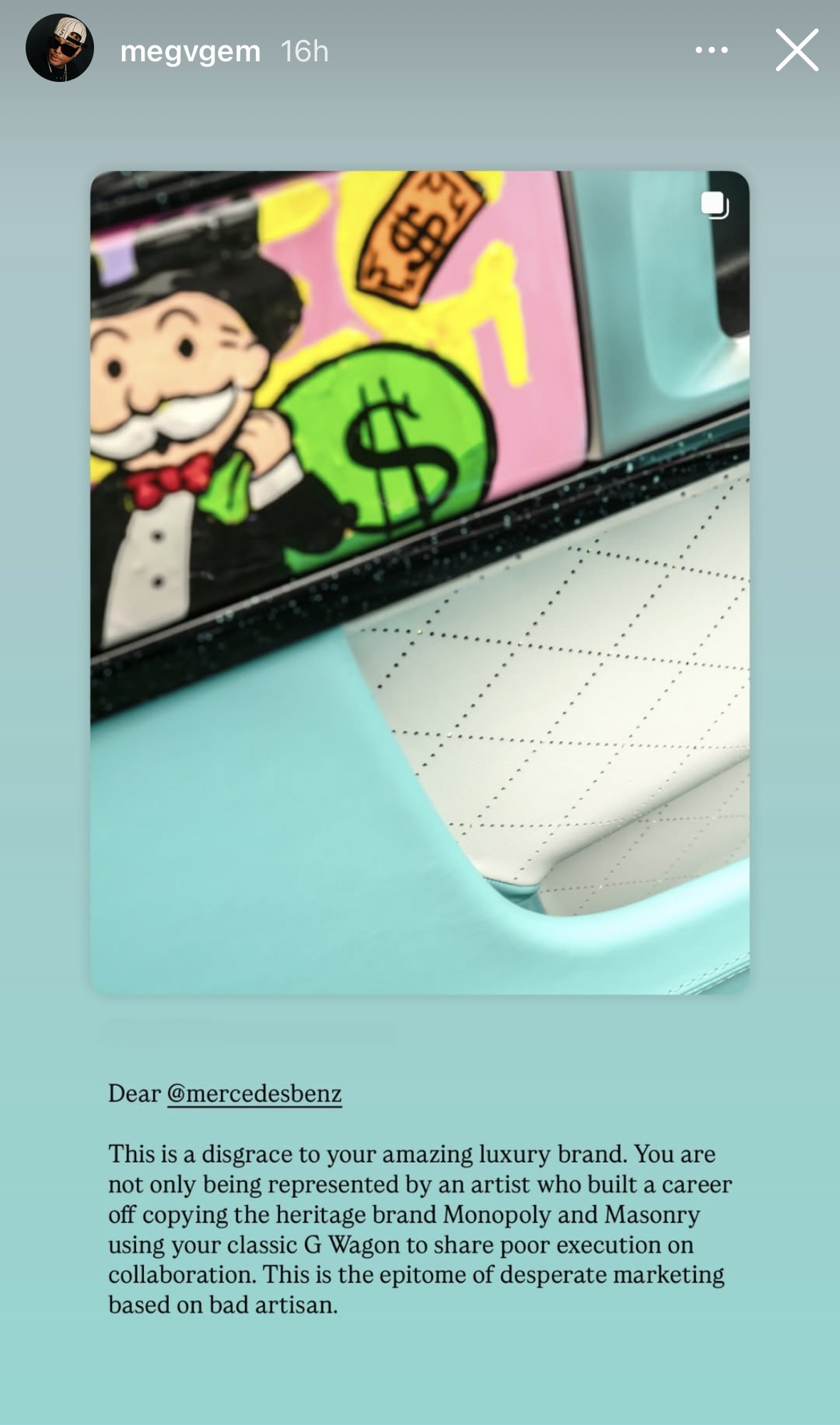 For Mega, he thinks this collab is a mismatch between Mercedes’ heritage and what he sees as a cheap gimmick. “You are not only being represented by an artist who built a career off copying,” he wrote, “but using your classic G Wagon to share poor execution on collaboration.”
